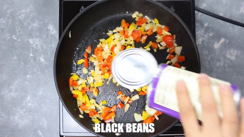 Heat olive oil in a pan. Toss in your onion and cook until it softens. Add the black beans, cumin, paprika, salt, and pepper.