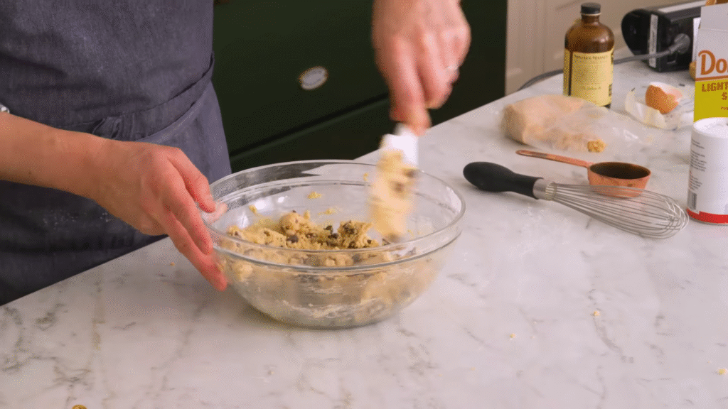Fold in the chocolate chips with a spatula. Try not to eat the dough (I know it’s tempting).