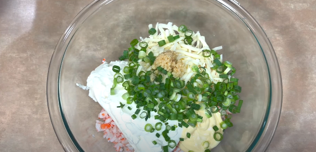 In a big bowl, mix softened cream cheese, sour cream (or mayo), shredded cheese, garlic powder, onion powder, and chopped green onions. Then fold in the crab meat.