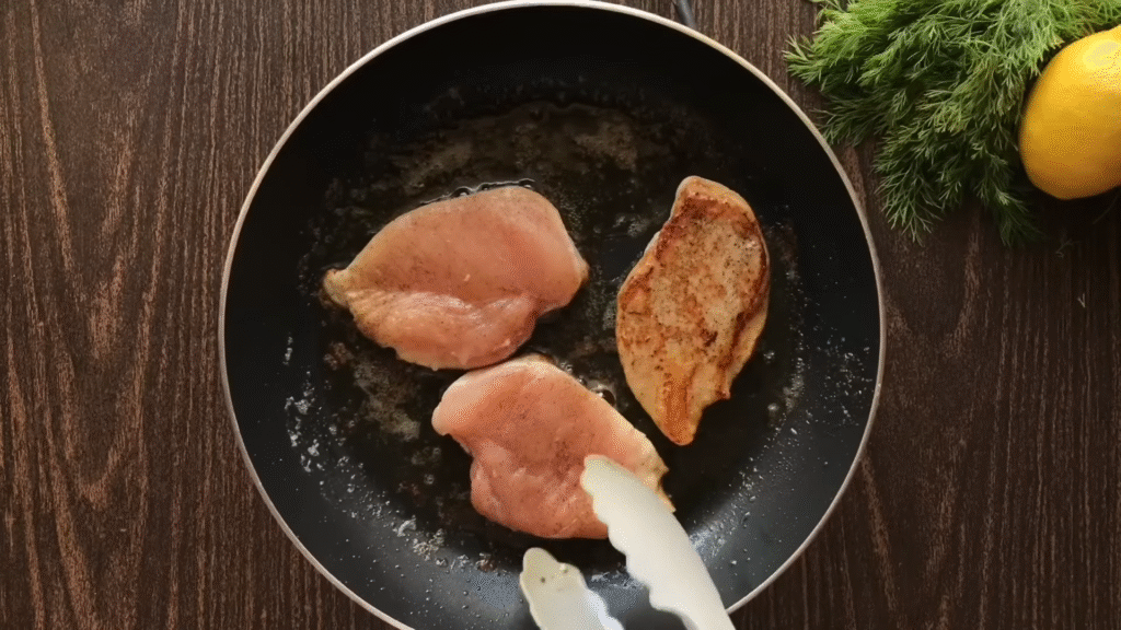 Heat olive oil (or butter) in a pan on medium heat. Place the chicken and cook for 4–5 minutes on each side until golden brown. Take it out and keep it aside for now.