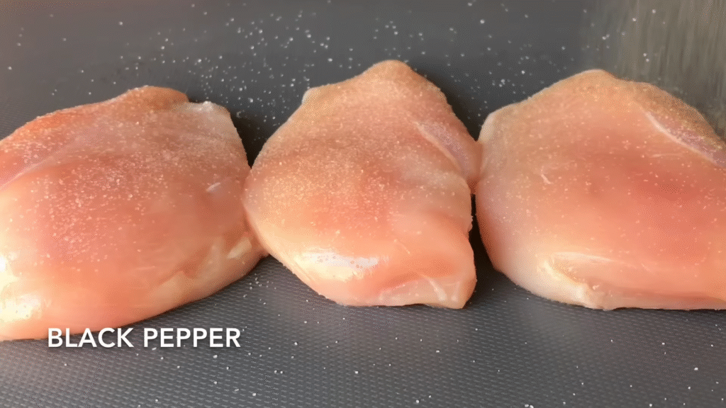 Pat the chicken dry with paper towels. Sprinkle salt and pepper on both sides. This makes the chicken flavorful from the inside.
