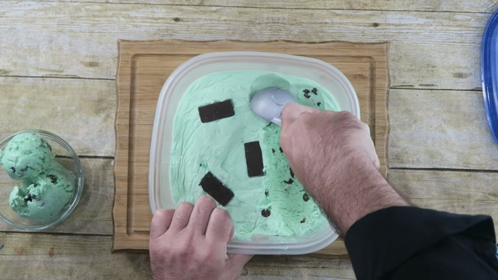 Transfer the ice cream into a container, smooth the top, and freeze it for about 4 hours or overnight. When it’s firm, scoop it out and enjoy your homemade mint chocolate chip masterpiece!