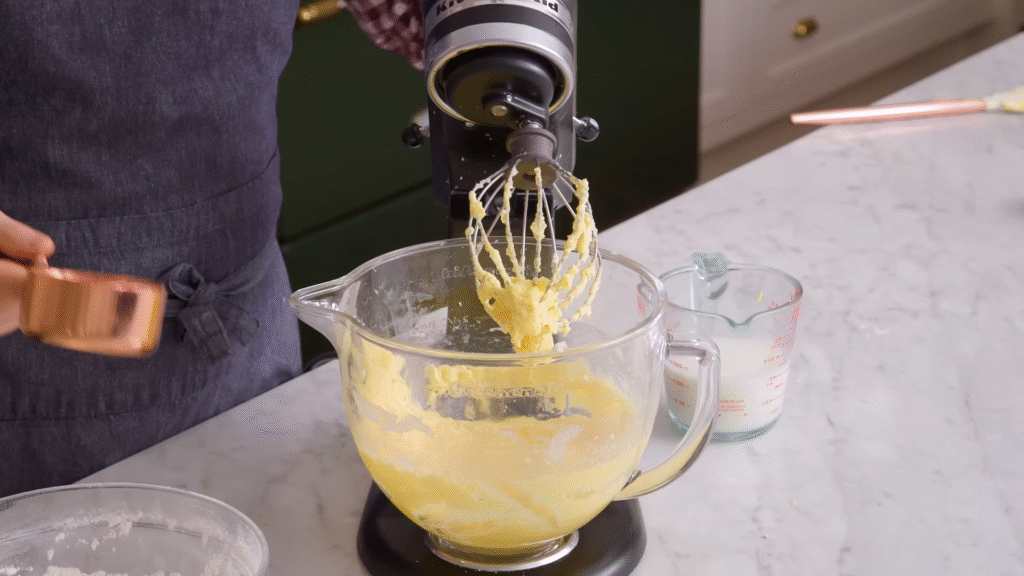 Now, add the flour mix and buttermilk little by little, starting and ending with flour. Mix gently. Overmixing makes the cake tough, so stop when it’s just combined.