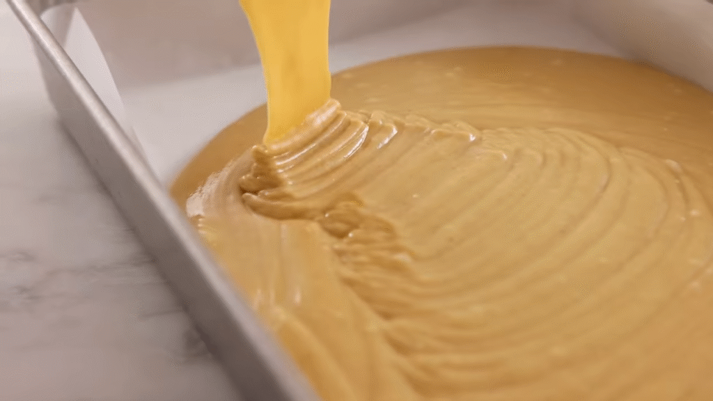 Grease a baking pan (8×8 works great) and pour the batter in. Spread it evenly with a spatula.