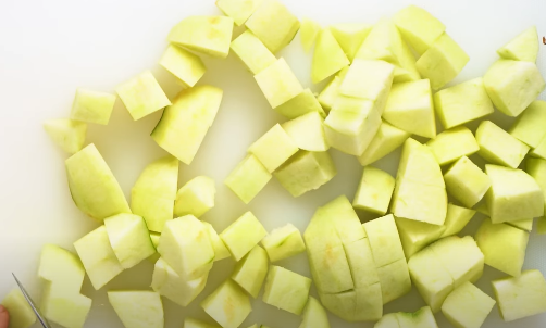 Wash the stalks well and cut them into small pieces, about ½ inch thick. Rhubarb leaves are toxic, so only use the stalks.