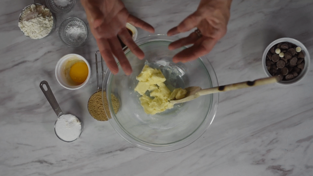Mix the softened butter with white sugar and brown sugar until smooth and creamy. This is what gives your cookies that perfect soft texture.