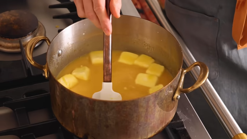 - In a saucepan, combine evaporated milk, sugar, egg yolks, and butter.