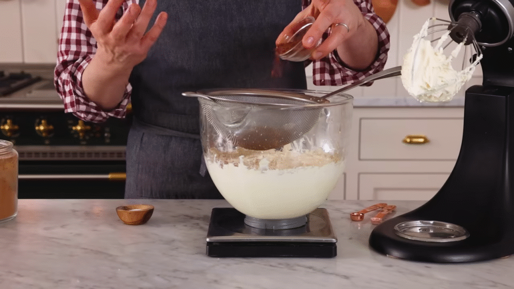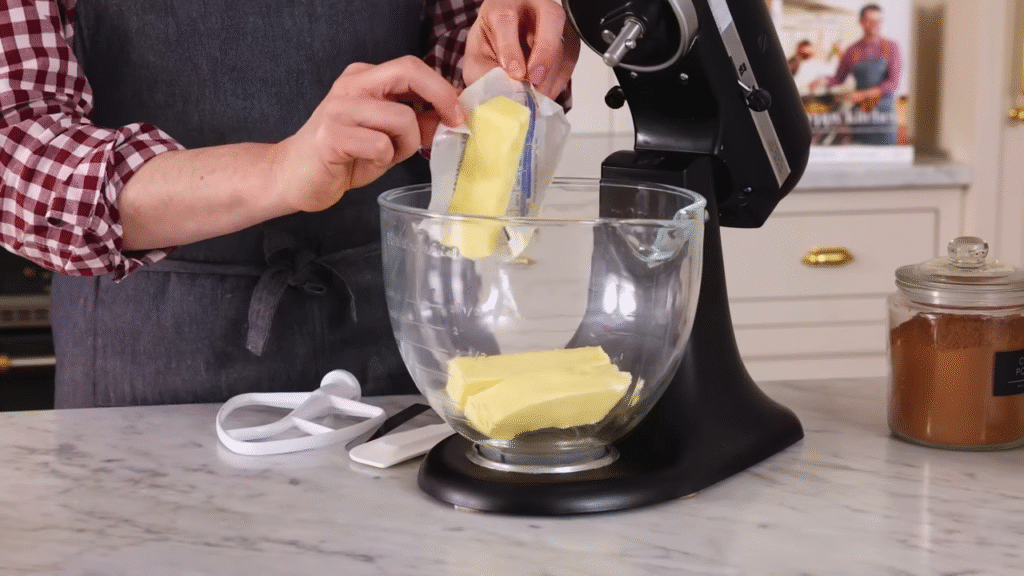 Start with softened butter. Put it in a mixing bowl and beat it with a hand mixer or stand mixer until it’s smooth and creamy. This usually takes about 2–3 minutes. Don’t skip this part—creamy butter is the secret to smooth frosting.