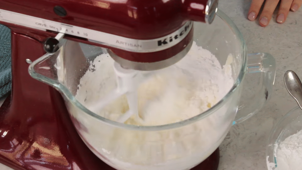 Add powdered sugar one cup at a time. Mix slowly first (so it doesn’t fly everywhere), then speed it up until it blends well. Keep scraping the sides of the bowl so nothing sticks.